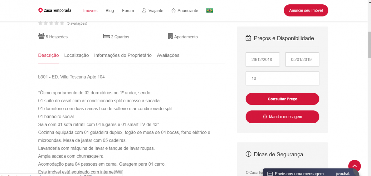 O CasaTemporada recomenda que as reservas sejam feitas diretamente na plataforma, pois assim estará protegido contra fraudes. O site CasaTemporada não se responsabiliza pelas reservas feitas diretamente entre viajante e anunciante, neste caso os Viajantes devem verificar a existência real do imóvel antes de fechar qualquer negócio. A verificação pode ser feita pedindo documentos pessoais do anunciante, bem como comprovante de residência atualizado bem como a verificação do anunciante em redes sociais e visita ao imóvel antes da viagem. Caso verifique algum anúncio de suspeito de fraude, favor encaminhar o link do anúncio por e-mail ao administrador do site para retirada imediata do site. O conteúdo dos anúncios, são de inteira responsabilidade dos respectivos ANUNCIANTES, e não responsabilizamos por qualquer prejuízo materiais ou danos morais, que o VIAJANTE possa sofrer.